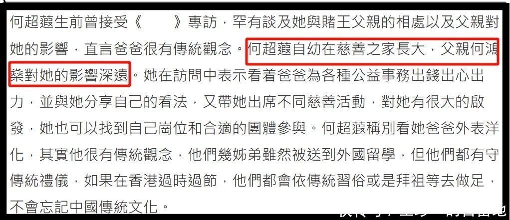 何超蕸生前曾接受港媒采访谈到了父亲对自己的影响。她回忆说她小时候看着父亲为各种慈善公益活动出钱出力,而且父亲还带她去参加这些活动,还与她分享自己的看法。