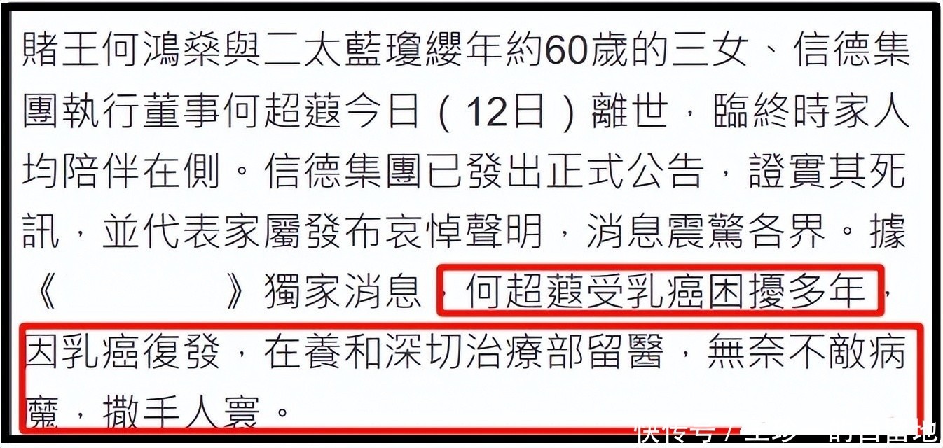 根据港媒的报道可知,何超蕸生前被乳腺癌困扰多年,因乳腺癌复发,她一直在养和医院治疗,但还是不敌病魔,不幸离世。